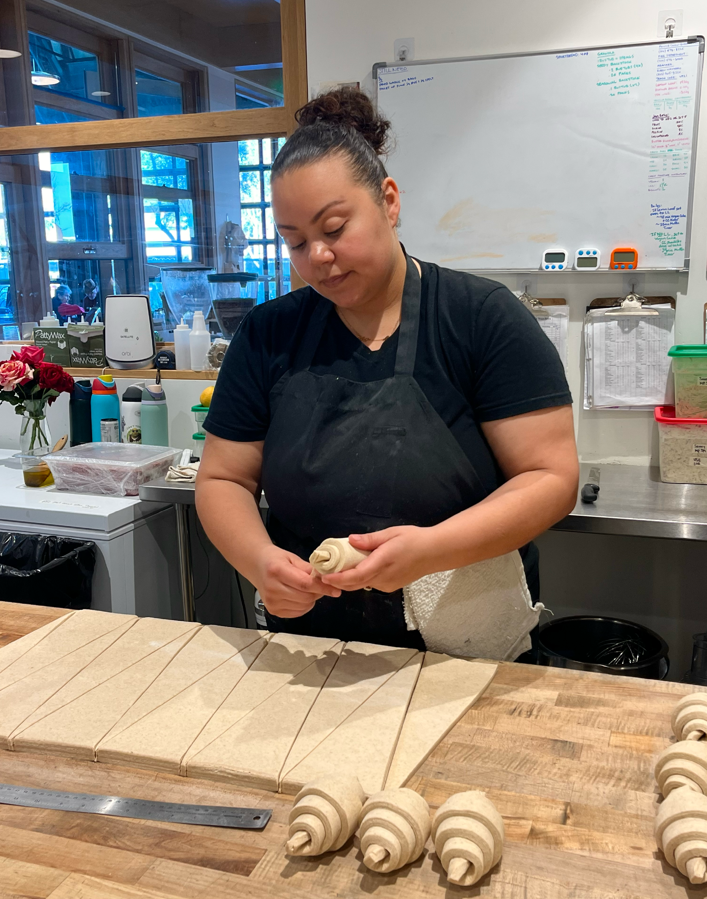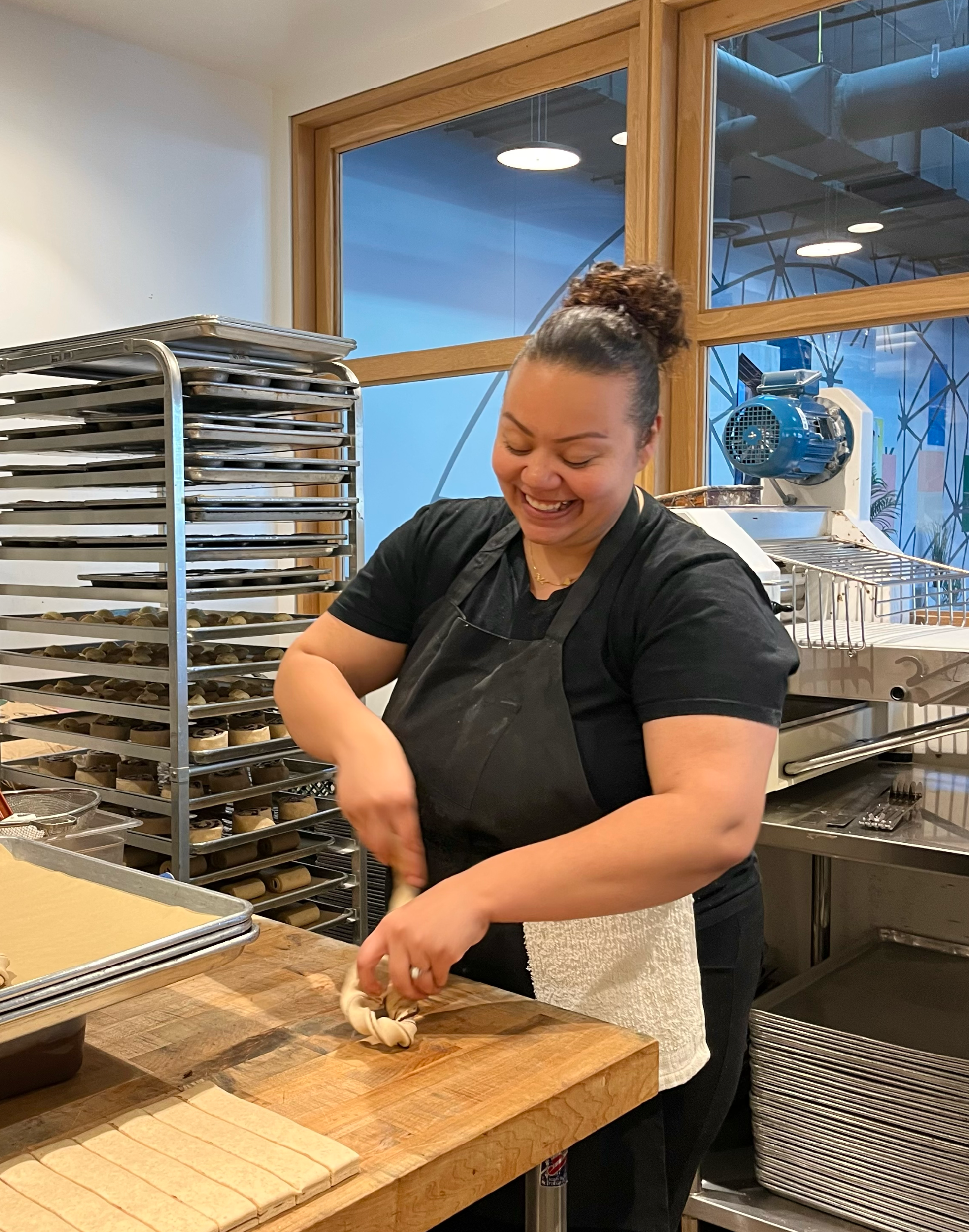 Her days at the bakery start early (around 5 a.m.), reviewing bakes, organizing production, and jumping in wherever needed. From shaping croissants (her favorite) to solving the daily puzzles of a busy kitchen, she thrives in the balance of precision and unpredictability. With 17 years of experience, she brings both structure and energy, often turning routine tasks into fun competitions to keep her team on track and engaged.